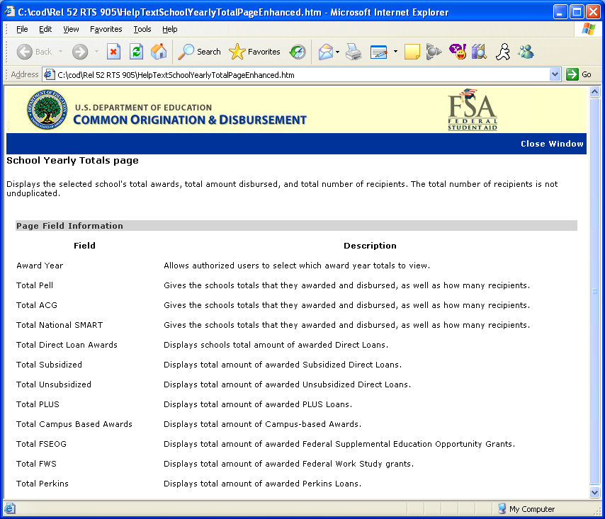 Figure 3 Existing Help Text for School Yearly Totals Page.