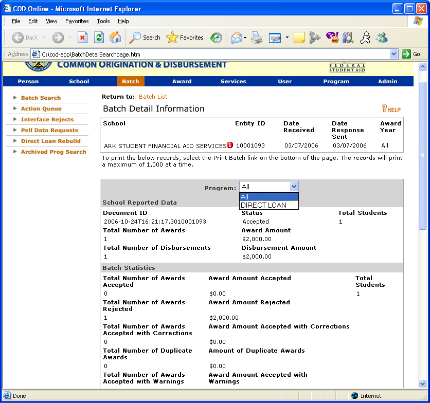 The Batch Detail Information page will allow authorized users to view and filter data by ACG program and award type. The program dropdown will display the programs found within the batch. The Award Type dropdown will allow authorized users to filter disbursement data by program.