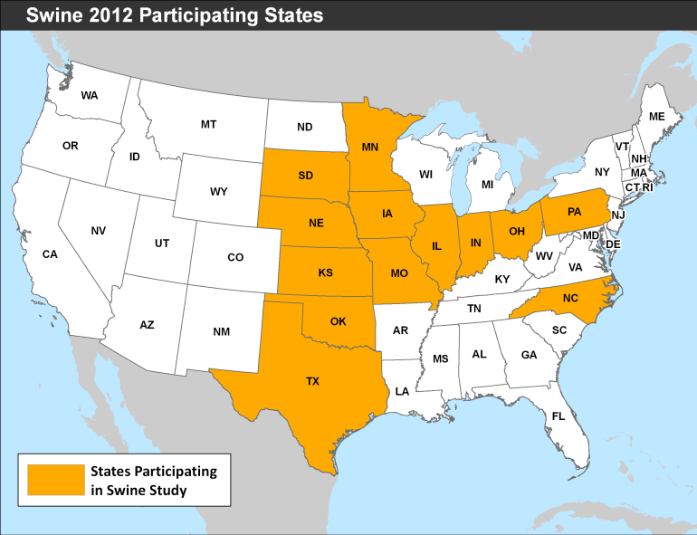 MO, NE, NC, OH, OK, PA, SD, and TX) will be asked to provide important health management and productivity information to characterize the swine industry (see map above). Fecal, blood, and other biological specimens will be collected for analysis on a subset of operations. Data collection will begin in June 2012.