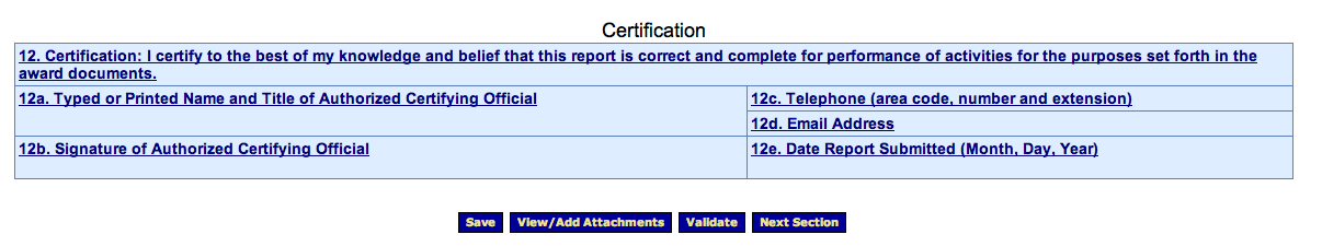 Screen 3 - This is the main navigational screen for grantees to move between sections of the report. Grantees can choose to return to this screen after completing each section.