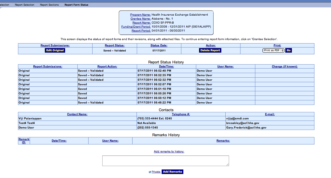 Screen 7 – Grantees and the awarding agency are able to track report status and revisions, as well as export the data reported.