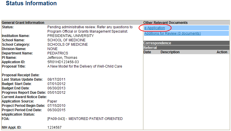 Figure 9: Status Screen and List of Applications/Grants Links 13