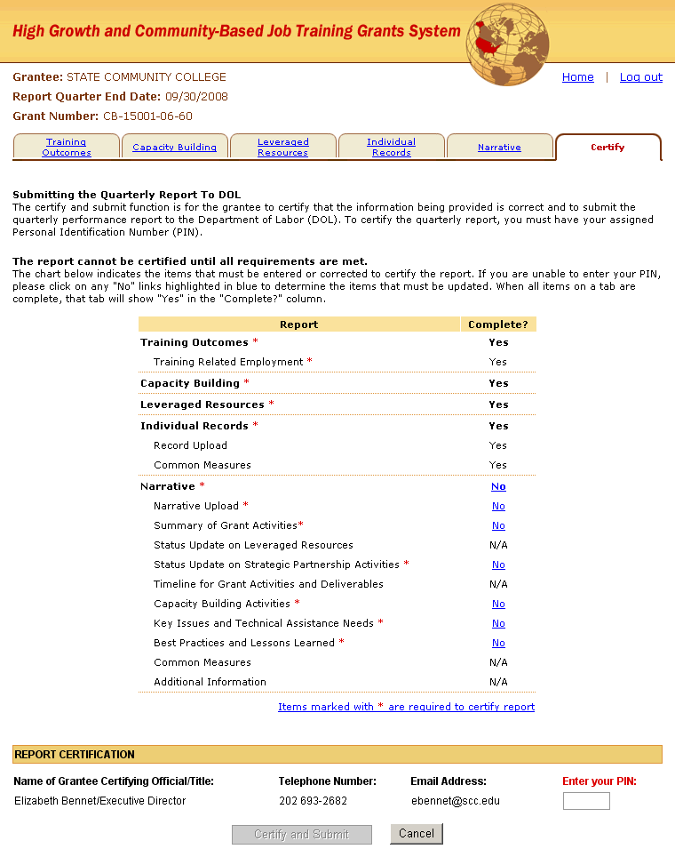 Click the Certify and Submit button to certify and submit your report. A confirmation email will be generated and sent to the contact email address that was entered on the Training Outcomes page. If you do not want to certify and submit at this time, click the Cancel button to return to the Home page.