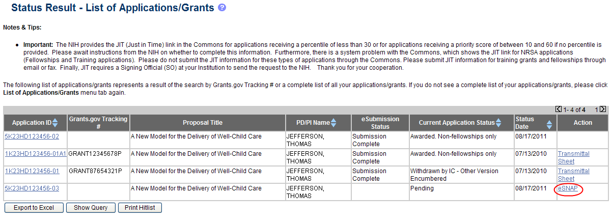 Figure 10: eSNAP Link on Status Result – List of Applications/Grants 14