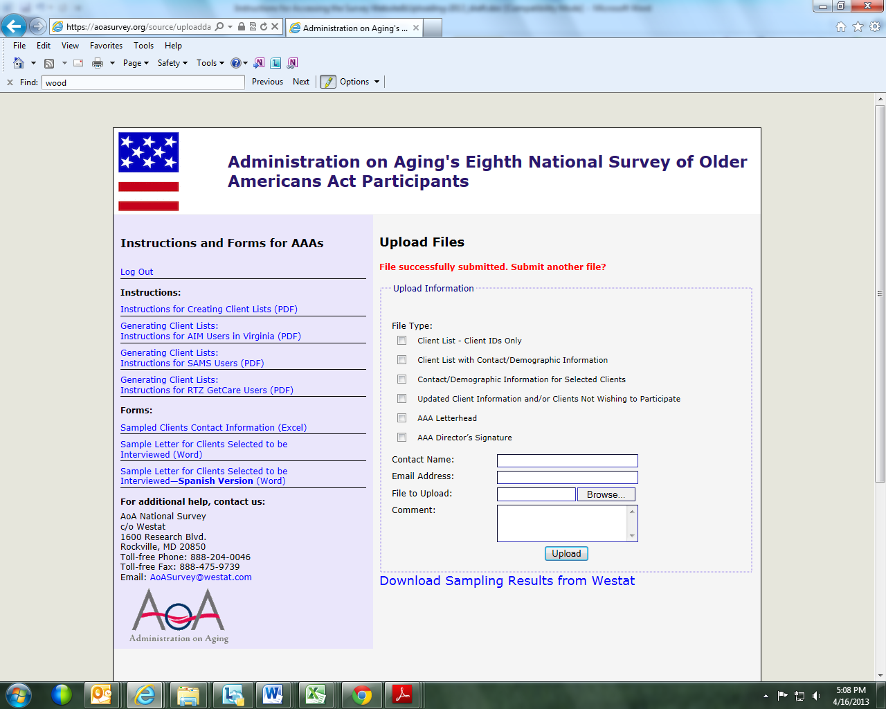 Upload the completed Sampled Clients Contact Information Form or other file containing client contact information to the AoA National Survey secure website https://aoasurvey.org/default.asp.