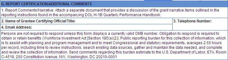 The instructions and performance reporting forms for completing these reports can be found in Section I General Instructions, 1.3 Instructions for Quarterly Progress Reports; 1.4 Submission Process, and Section III Instructions for Completing H-1B Quarterly Performance Reports (QPR) and How a QPR is Generated and Section IV Instructions for Quarterly Narrative Report Submissions of this handbook.