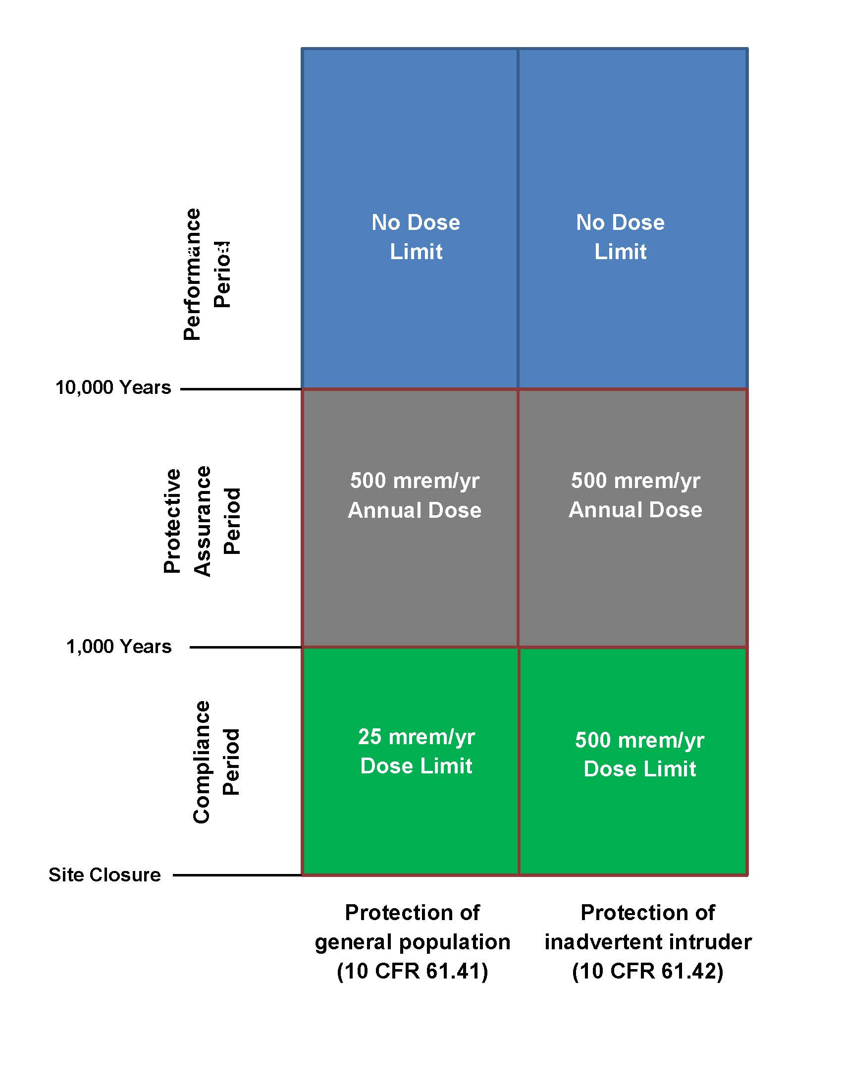 The proposed changes introduce period analyses to 10 CFR Part 61. These proposed period analyses are broken down into three tiers (see figure 1). The first period of analyses, termed the compliance period, starts at the site closure and extends out to 1,000 years. The second period of analyses, termed the protective assurance period, starts 1,000 years after site closure and extends to 10,000 years after site closure. The last period of analyses, termed the performance period, starts after 10,000 years from site closure.