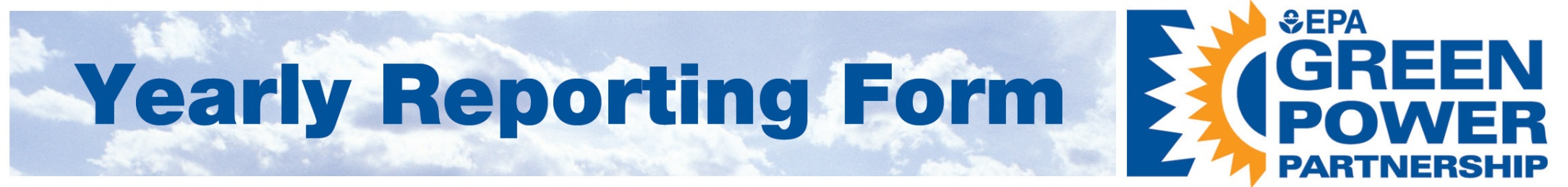 | This Yearly Report form should be used to update the EPA on your organization's green power usage. Please complete the report, save the file, and return to your account manager or Mollie Lemon at your earliest convenience. Mollie Lemon's email address is lemon.mollie@epa.gov. | |||