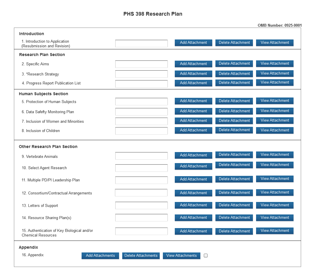 If you are responding to a specific funding opportunity announcement (e.g., PA or RFA), address any requirements specified by the FOA. Reviewers will assess the information provided in this Section, and any questions associated with select agent research will need to be addressed prior to award. Save this file in a location you remember. Click Add Attachment, browse to where you saved the file, select the file, and then click Open. |