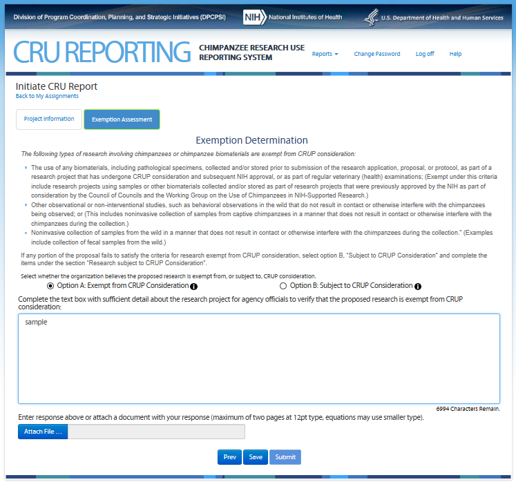 Applicants and offerors are strongly discouraged from resubmitting their grant application, contract proposal, or protocols as an attachment to the Chimpanzee Research Use Form. The CRUP does not require those documents and will not otherwise have access to the investigator’s grant application, contract proposal, intramural protocol, third party protocol, or the results of peer review or technical evaluation (e.g., summary statement or technical evaluation report).