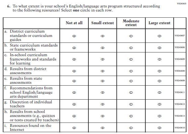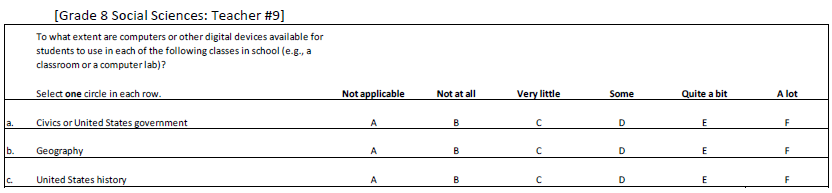 The stem and response options were revised to maintain consistency with a similar Civics instructional strategy item in teacher. "For example" was replaced with "e.g." for consistency with the abbreviation conventions used across all teacher and school questionnaires. Previous sub-item d (current c) and current sub-item i had revisions to wording for improved clarity. To achieve consistency with the revised wording of the parallel student item, current sub-items f and g were the result of disaggregation of the previous sub-item version. |