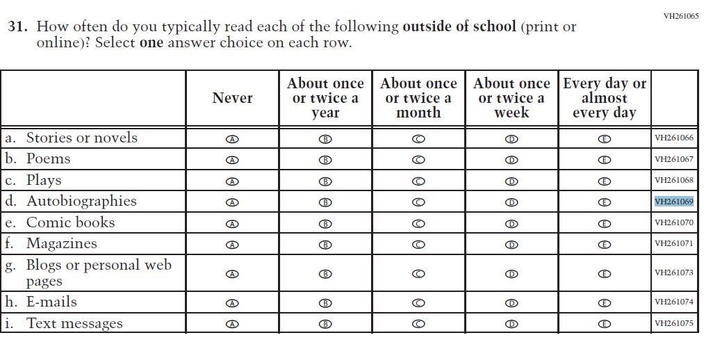 Sub-items were revised to consistently list plural items in parentheses. The response options were revised to those used in parallel 2016 Mathematics pilot items. Sub-items a and c were revised to provide simpler wording in place of "anthropologist" and "multimedia". |