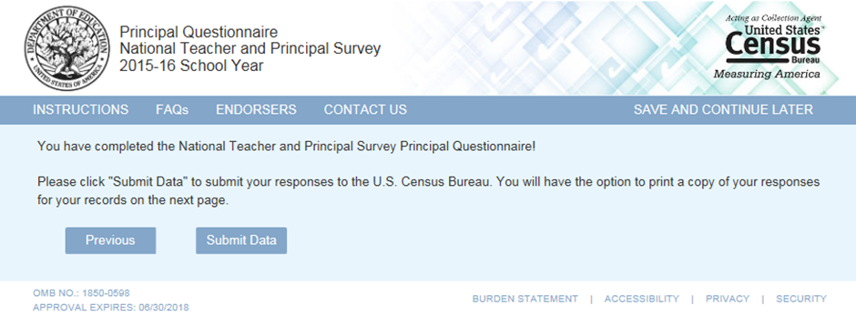 NTPS and SSOCS are administered by the U.S. Census Bureau on behalf of NCES on a recurring basis. The collected data are crucial in helping legislators and education leaders make informed decisions to improve education. By participating in these surveys, you will ensure that information about your district’s schools, principals, and teachers is included in those decisions. No student or classroom time is involved in either survey.