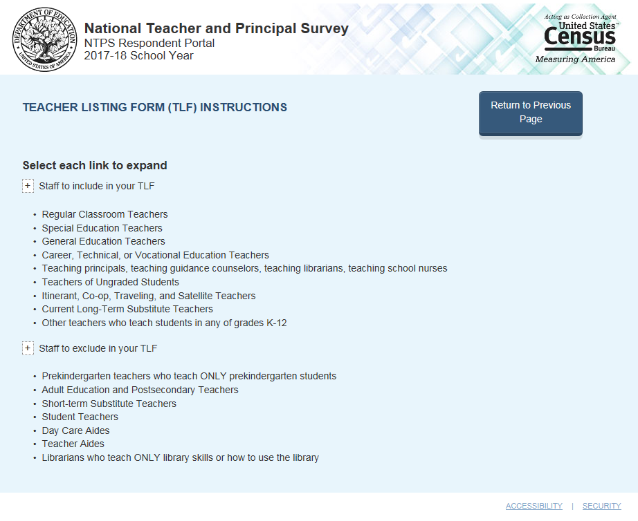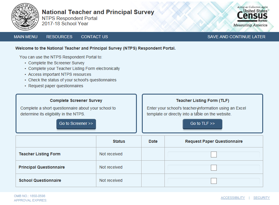 Complete a screener survey, which collects basic information about the school, confirms the eligibility of the school in the NTPS, and establishes a point of contact at the school (a “survey coordinator”) for subsequent NTPS data collection operations;