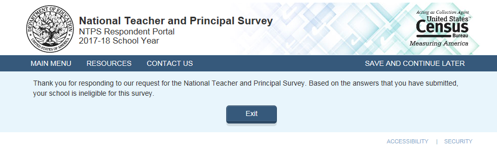 Respondent only accesses this page if the answers to the questions on Screener Interview Pages 4 (school type) or 7 (ungraded school) indicate that the school is out of scope for NTPS.