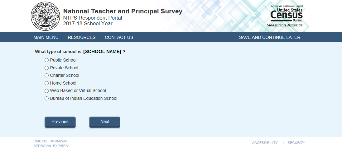 The respondent can choose only one school type option on this page. The purpose of this question is to confirm whether schools are eligible (in scope) for NTPS. The purpose of this question is to confirm whether schools are eligible (in scope) for NTPS.