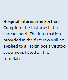 | Stool Specimens Toxin Positive for C. difficile (Y/N)* | Select Yes or No from the drop-down list. Does the hospital have any final stool cultures toxin positive for CDI for patients in the calendar quarter referenced? | |