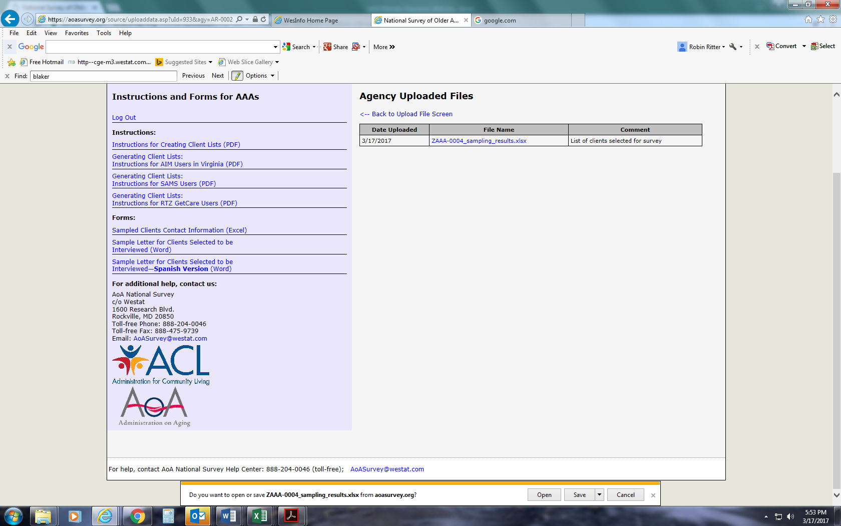 To download the sampling results provided on a completed or partially-completed Sampled Clients Contact Information form, log into the secure portion of the website using your AAA-ID and password (see Step 2).