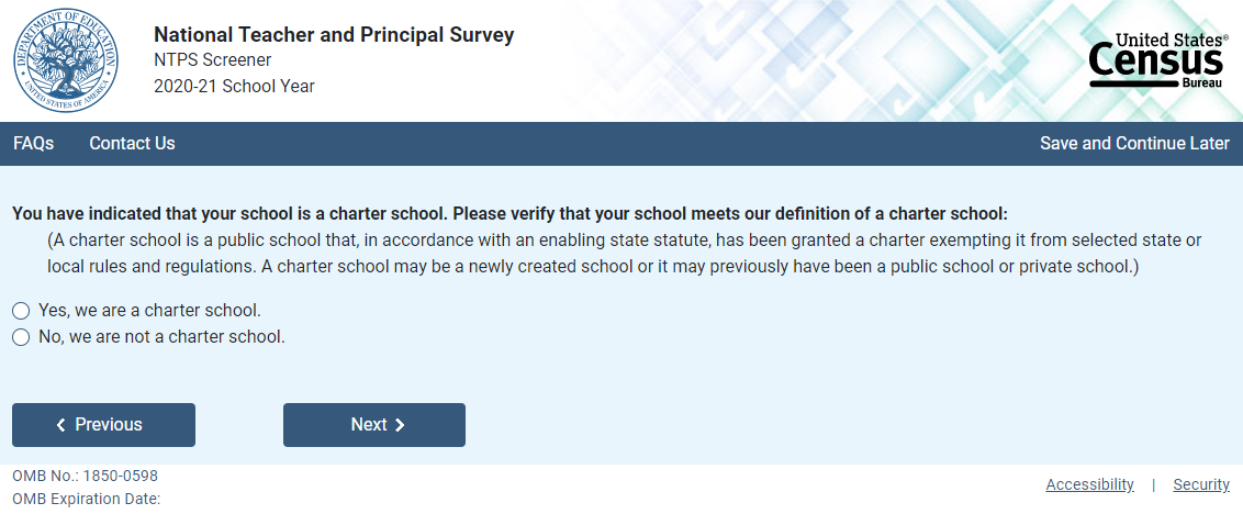 The NTPS Screener is a web-based survey, the purpose of which is to collect basic information about the school, confirm the eligibility of the school in the NTPS, and establish a point of contact at the school (a “survey coordinator”) for subsequent NTPS data collection operations.