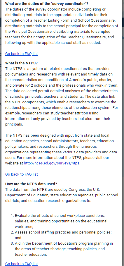 This is a list of frequently asked questions and their responses that you can refer to if you would like additional information about the National Teacher and Principal Survey.