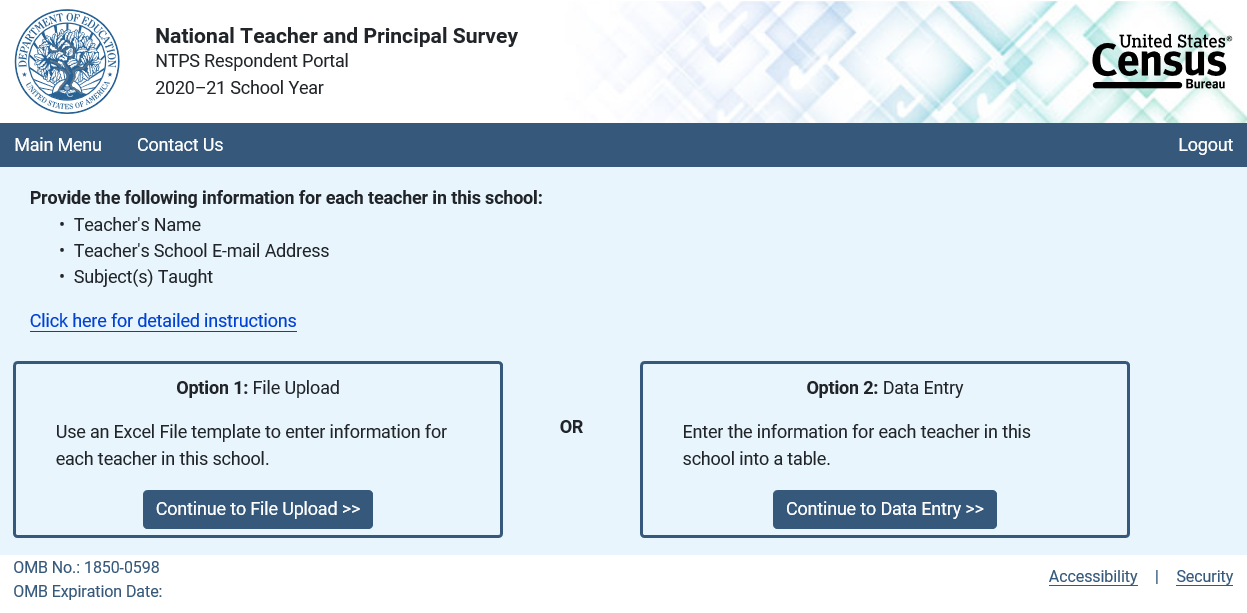 When the respondent clicks “Click here for detailed instructions,” the Teacher Listing Form instructions modal pop-up opens on the screen. When the respondent clicks the button for Option 1: File Upload, (s)he is directed to the File Upload page. When the respondent clicks the button for Option 2: Data Entry, (s)he is directed to the Summary page.
