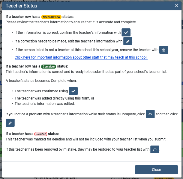 If the respondent clicks “Click here for important information about the other staff that may teach at this school…” link, the Teacher Listing Form Instructions modal pop-up is shown.