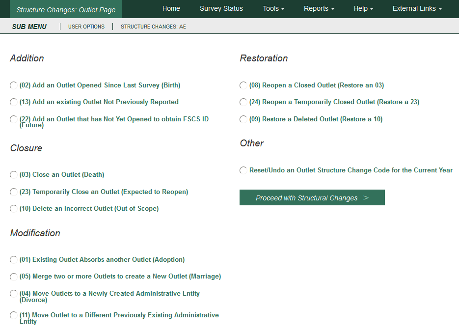 These tabs provide a list of all closed, deleted, and temporarily closed entities for your state. We suggest checking these tabs to make sure that any AEs or outlets you are trying to open (birth; Structure Code 02) are truly new.