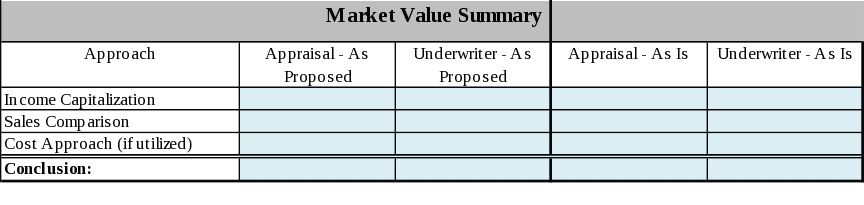 Charts: The charts contained in this document have been created with versatility in mind; however they will not be able to accommodate all situations. For this reason, you are allowed to alter the charts as the situation demands. Be sure to state how you have altered the charts along with your justification. Include all the information the form calls for. Charts that include blue text indicate names that should be modified by the lender as the situation dictates.