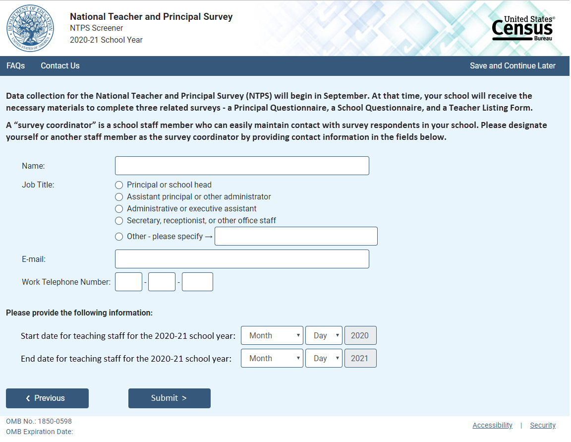 The NTPS Screener is a web-based survey, the purpose of which is to collect basic information about the school, confirm the eligibility of the school in the NTPS, and establish a point of contact at the school (a “survey coordinator”) for subsequent NTPS data collection operations.