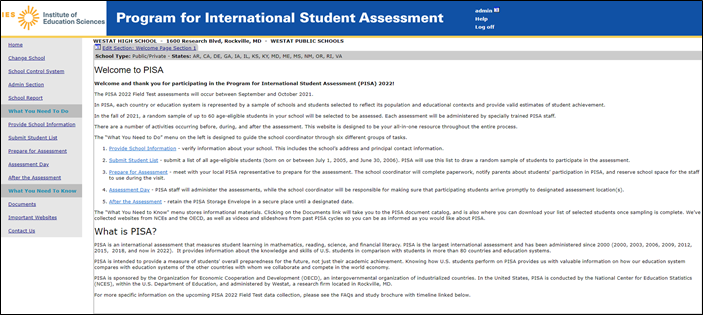 Throughout this document are screenshots that show the web content of MyPISA.us for schools and school coordinators from the field test in PISA 2021, along with text for the main study for PISA 2022. The last section of this document, “MyPISA project website for School Coordinators and schools,” documents the contents of the website most extensively, but MyPISA screenshots also appear throughout the sections, “Instructions for School Coordinators to E-file student lists,” and “PISA 2022 Main Study School Coordinator Handbook”. MyPISA.us is described in Part B of the main study package. The systems for the PISA 2022 field test are currently inactive, but will be reactivated in the spring of 2021. Additional changes will be needed to update references to the PISA main study and updates to the specifics of the main study, such as the appropriate birth year of students within the sample and the number of students to be sampled.
