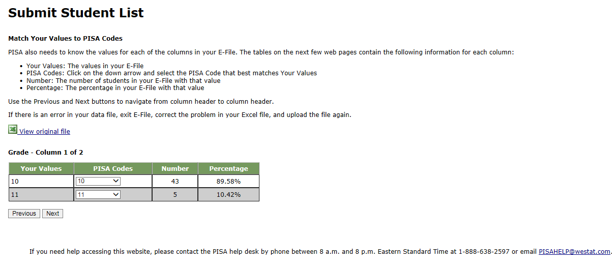 It is preferred that you include column headers as the first row in your E-File (see the template above for example). However, E-Files without column headers will be accepted. If you cannot submit your student data with this information in an Excel file, please call or email the PISA help desk at PISAHELP@westat.com or call 1-888-638-2597.