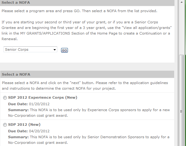 A list of NOFA options will appear. Select the appropriate NOFA and click the “next” link.