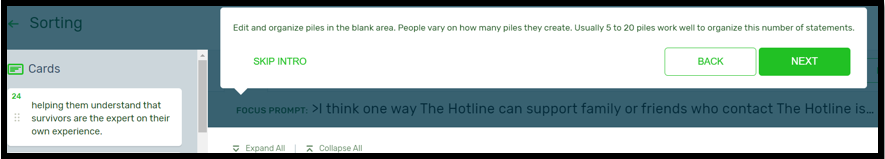 * Text in screen shot: “Edit and organize piles in the blank area. People vary on how many piles they create. Usually 5 to 20 piles work well to organize this number of statements.” NOTE: All example statements under “Cards” will be removed before data collection.