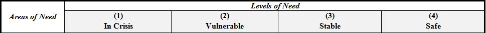 In this example, the program recorded the Support System in the U.S. level of need for new clients at intake or soon afterwards (N= ). Twenty were at the crisis level and 40 were at the vulnerable level. At the end of the budget period, the program reassessed the clients’ level of need. Ten clients moved from crisis to stable, 5 from crisis to safe, 25 from vulnerable to stable, and 10 moved from vulnerable to safe. The total number of new clients that moved from crisis and vulnerable to stable and safe during the budget period was 50.