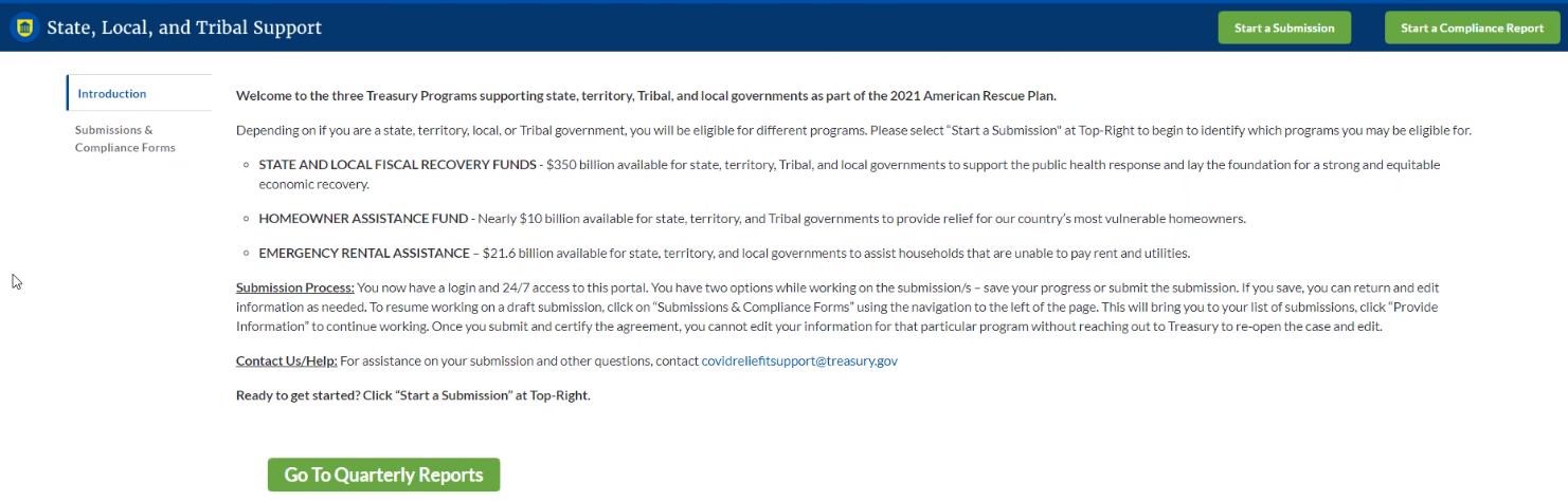 This User Guide contains detailed guidance and instructions for SLFRF recipients in using the Treasury reporting portal for submitting the required reports. All recipients must submit the required reports via the Treasury reporting portal. This guide is not comprehensive and is meant to be used in conjunction with the references mentioned above.