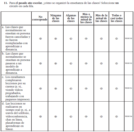The stem of this item was revised from "when your school was closed last school year" to "for last school year" to remove references to school closures. |