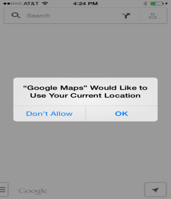 This will take you to the first screen in the Google maps app. A pop-up screen will appear that says “Google Maps would like to use your current location”. Click on OK so that the device can pick up your location to provide accurate directions to your desired destination.