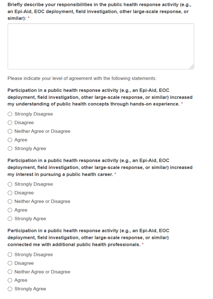 Change type: Question revision Change to: Briefly describe your responsibilities in the public health response activity (e.g., an Epi-Aid, EOC deployment, field investigation, other large-scale response, or similar): |