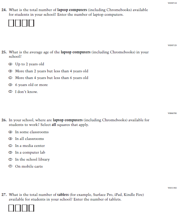 This Appendix F provides the library of possible items to be used in the NAEP 2022 questionnaires. Non-substantive wording changes to the questionnaire items (based on ongoing and future cognitive and pilot testing results), if any will be made, along with the final selection of which items will be used in the final versions of the NAEP 2022 questionnaires, will be provided as outlined below. The number of items selected for each type of respondent will be appropriate to the allocated time (as indicated in the Supporting Statement Part A section A.12).