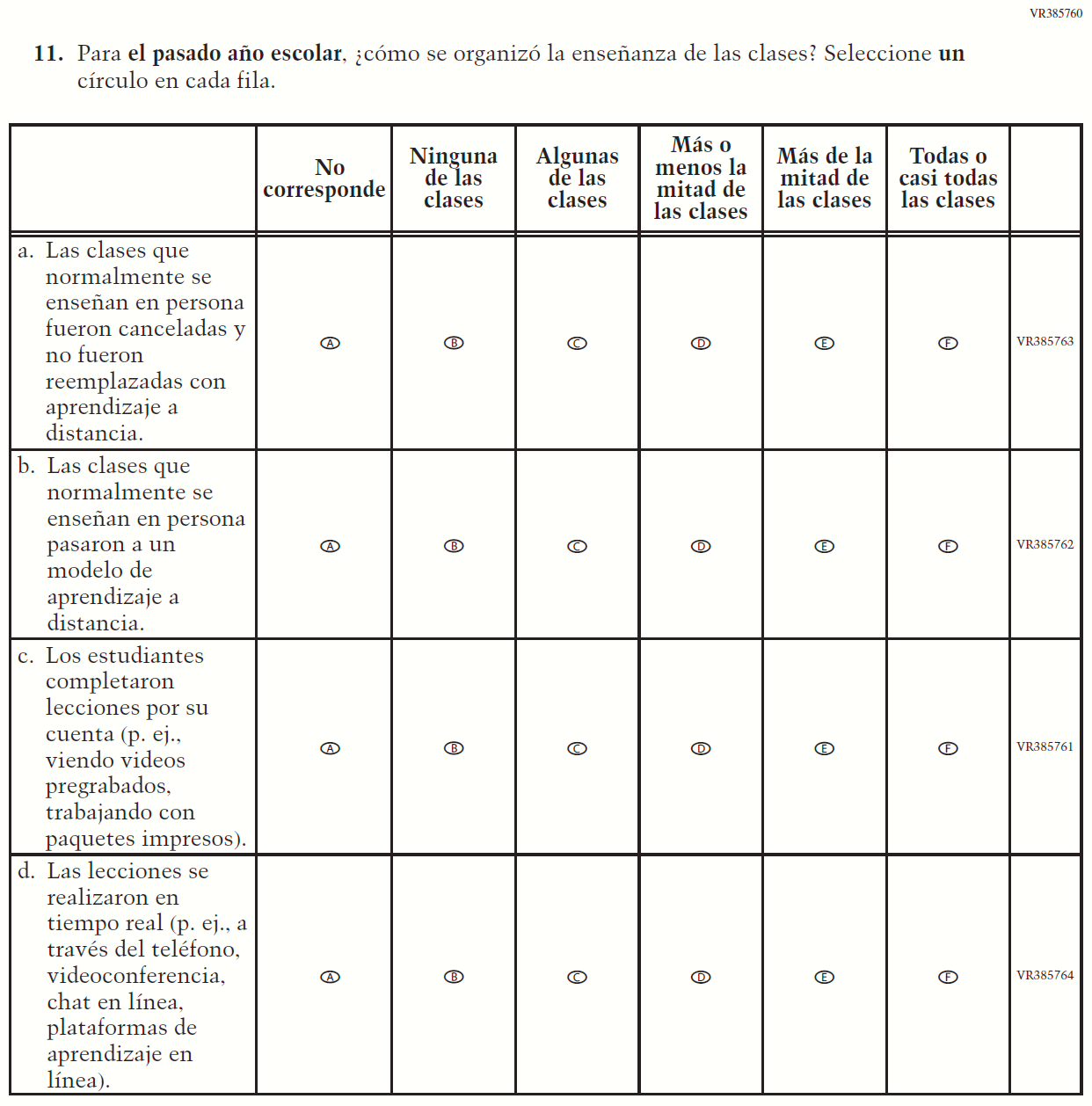 This item is based on Question 6 above and was added to understand school structures in distance learning format. The stem is revised from “has the structure of this school year been modified” to “was the structure of last school year modified”.
