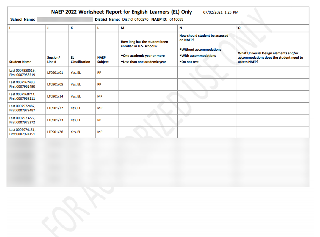 NCES estimates the time required to complete this information collection to average 270 minutes for schools that do not submit student sample information or 390 minutes for schools that submit student sample information manually, plus an additional 10 minutes for each student identified as SD or EL, including the time to review instructions, search existing data resources, gather the data needed, and complete and review the information collection. This voluntary information collection was reviewed and approved by OMB (Control No. 1850-0928). If you have any comments concerning the accuracy of the time estimate, suggestions for improving this collection, or any comments or concerns regarding the status of your individual submission, please write to: National Assessment of Educational Progress (NAEP), National Center for Education Statistics (NCES), Potomac Center Plaza, 550 12th St., SW, 4th floor, Washington, DC 20202, or send an email to: nces.information.collections@ed.gov.