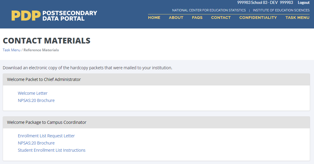 Your participation in the National Postsecondary Student Aid Study, or NPSAS, is important. NPSAS is the primary data source used to understand the effectiveness of federal student financial aid programs and to make decisions that affect students, their families, and the institutions they attend. As an institution participating in the NPSAS:24 field test, you will be expected to complete several steps over the 2022-23 academic year. You will complete these steps through the Postsecondary Data Portal, or PDP, website. The PDP website is the data collection website for all NCES institution-based postsecondary sample surveys. |