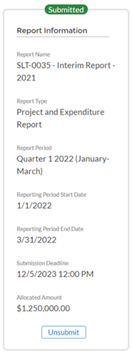 Project and Expenditure Report: Recipients will have an opportunity to reopen and provide edits to their submitted Project and Expenditure Reports anytime before the reporting deadline. Recipients will then be required to re-certify and submit the report again to properly reflect any edits made.