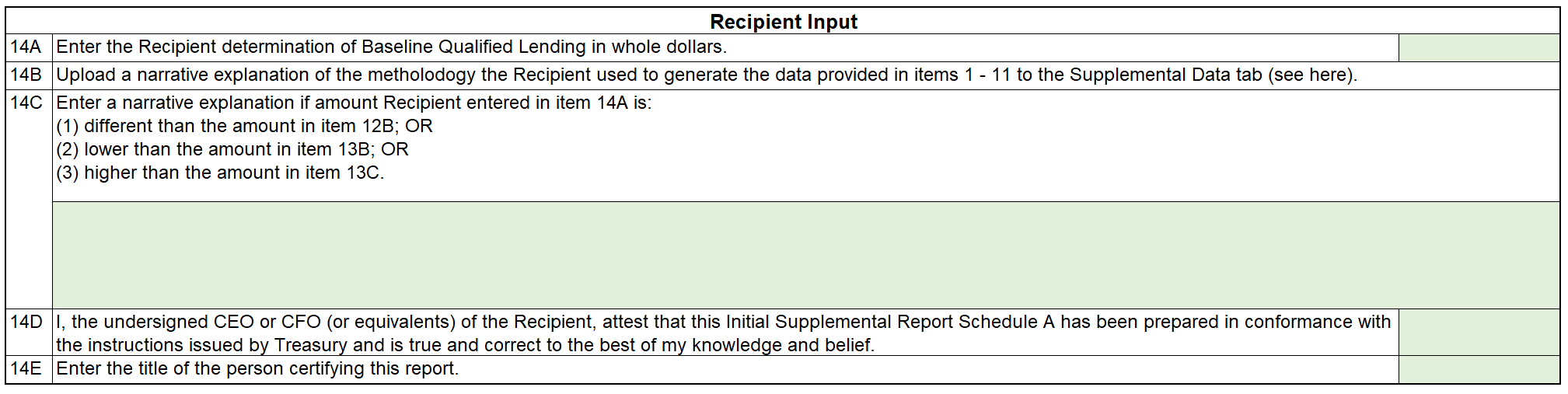 You will be presented with Recipient Input fields, like the example below. Report your Baseline Qualified Lending in item 14A. Please see the Line-Item Instructions for Schedule A–Baseline Qualified Lending Calculation (Section II.B) in these instructions for more information on how to determine Baseline Qualified Lending. You will be required to attach a narrative explanation if the Applicant reports an amount in item 14A that is either: (i) different than the amount listed in item 12B; (ii) lower than the amount in item 13B; or (iii) higher than the amount listed in item 13C.