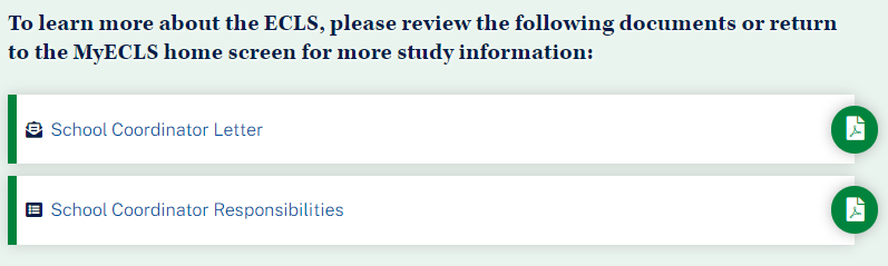 Para conocer más sobre el ECLS, por favor descargue los siguientes documentos, avance para ver resultados de estudios anteriores o regrese a la página principal de MyECLS, para más información sobre el estudio.