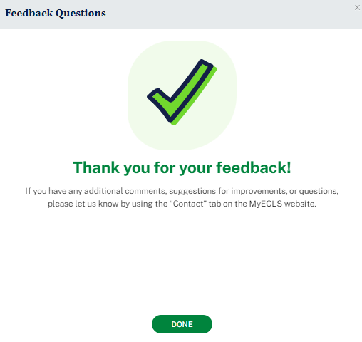 Gracias por sus comentarios. Si tiene comentarios, sugerencias para mejorar la encuesta o preguntas adicionales, nos los puede comunicar usando la pestaña de contacto de la página de Internet MyECLS.