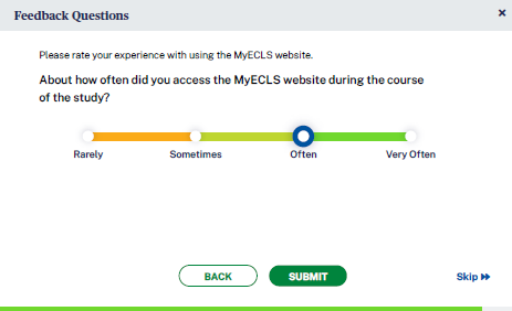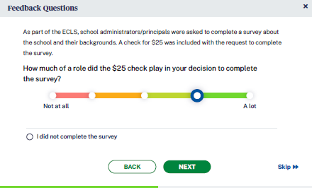 Note that, for all feedback questions, if the next button is selected without selecting a response or ‘skip,’ the following message displays: