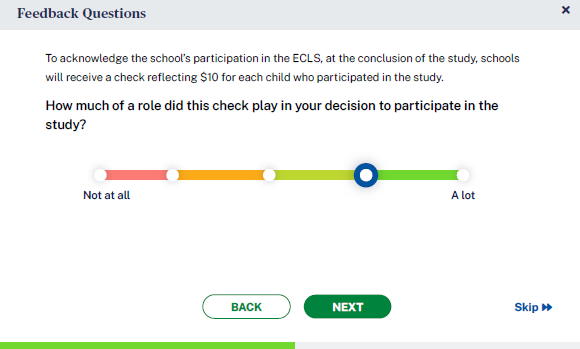 [IF PARENT IS IN SCHOOL THAT RECEIVES PARENT INCENTIVES, DISPLAY:] As part of the ECLS, parents were asked to complete a survey about their family and home environment. A prepaid Mastercard® worth $15 was included with the request to complete the survey.