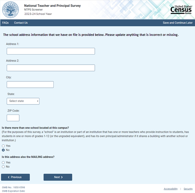 NOTE: Address fields are pre-filled with the sampled school’s information; however, only the address fields (not school name) can be edited on this page.