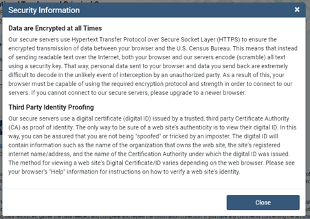 Security is a modal pop-up that will appear over whichever page the respondent was on when (s)he clicked on the “Security” link located on the bottom of the webpage.